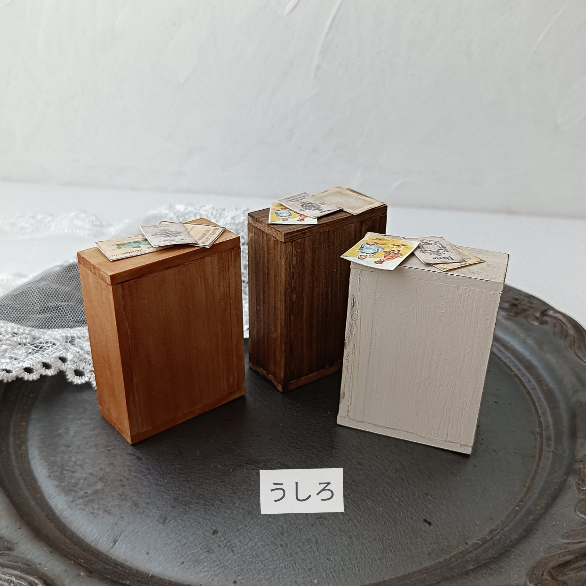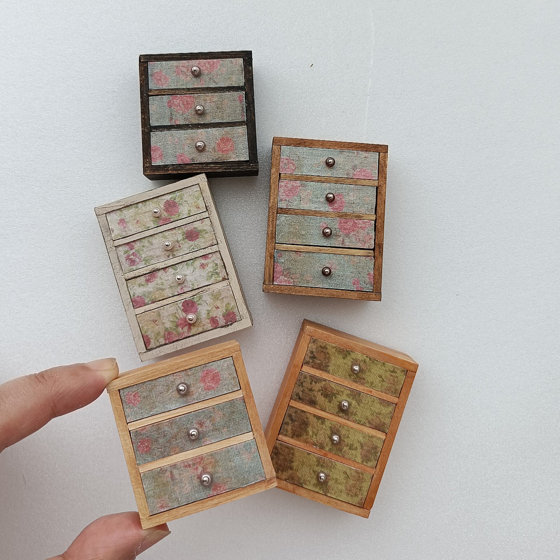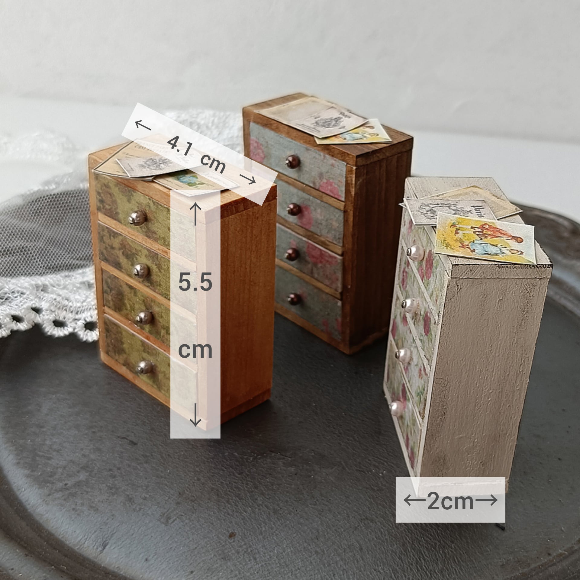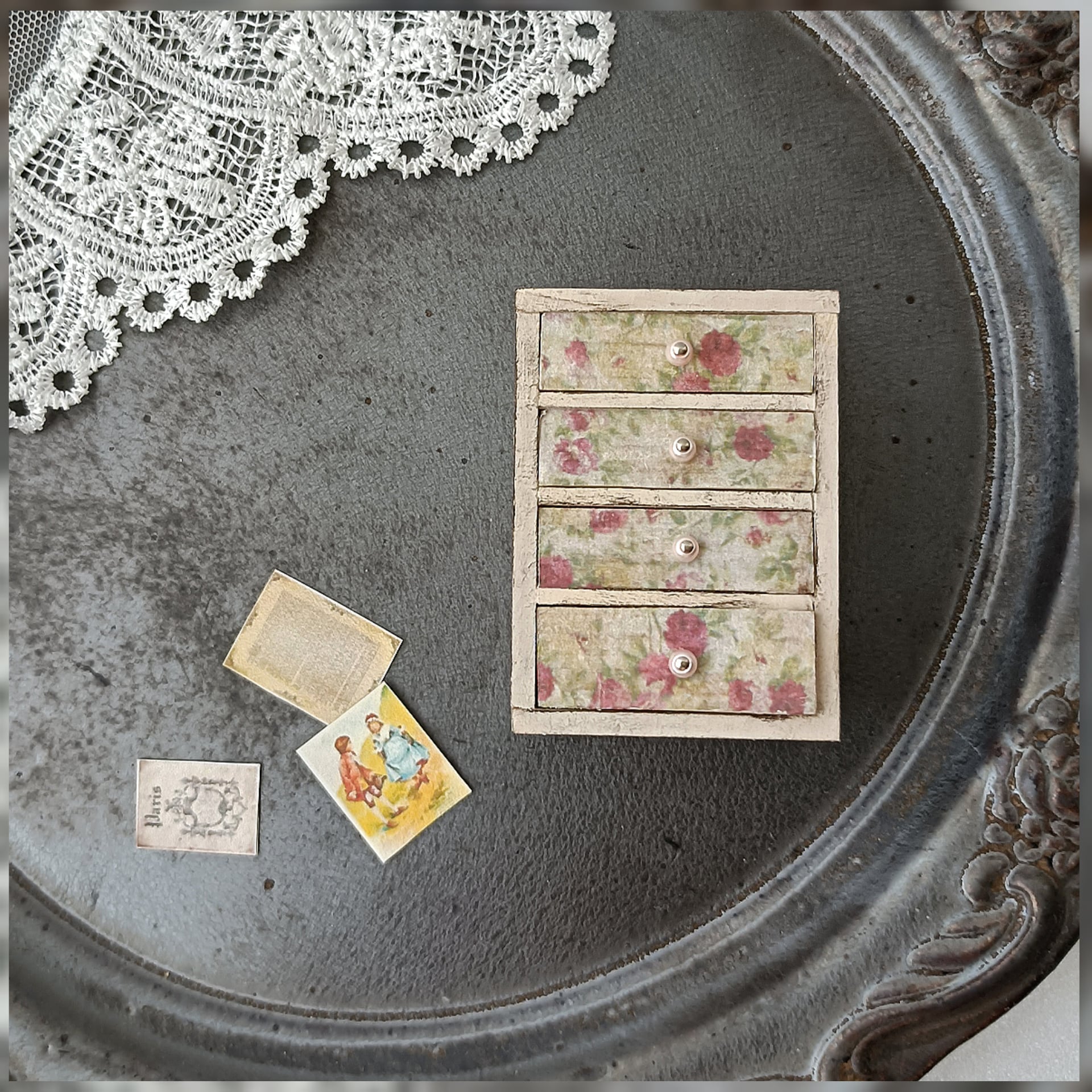 アンティークな雰囲気 花柄のチェストです 机の上やカウンターの上などで活躍しそうです! いろんな使い方で お楽しみ頂けます 本体はクリーム色で塗装後 ダークブラウンで汚しました サイズは画像を参照ください 画像1枚目のチェストと紙類のセットです