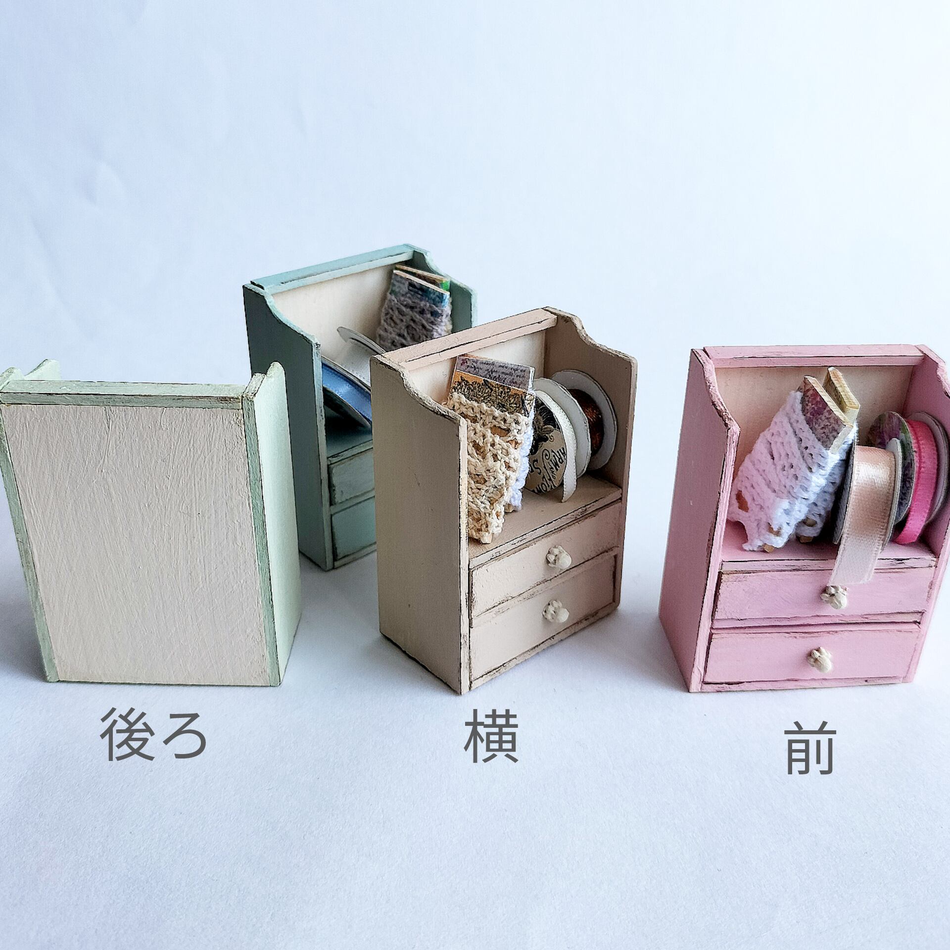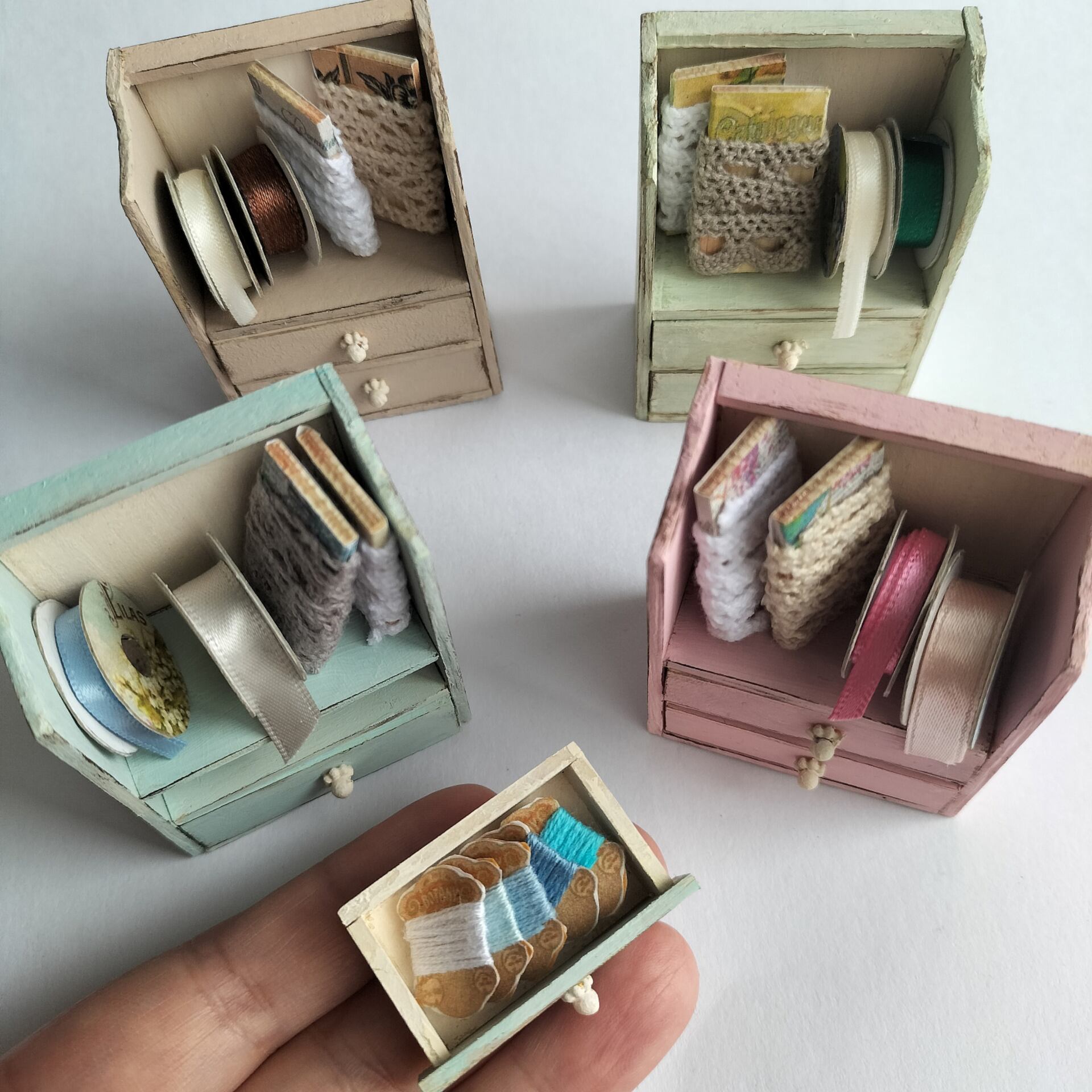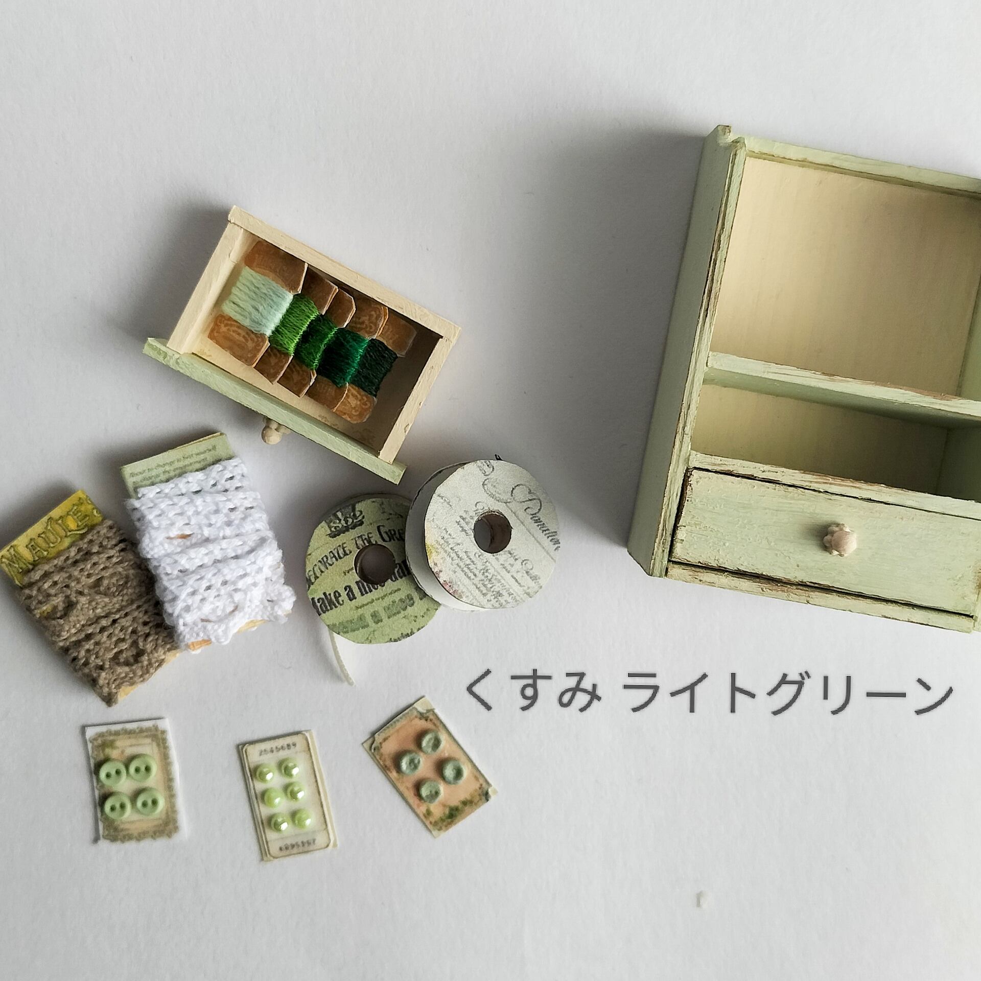 ちいさなソーイングセットです。 ◆セット内容◆ ❍ 木製のミニチェスト ❍ リボン 2巻 ❍ レース 2巻 ❍ ボタン 3種 ❍ 糸 5種