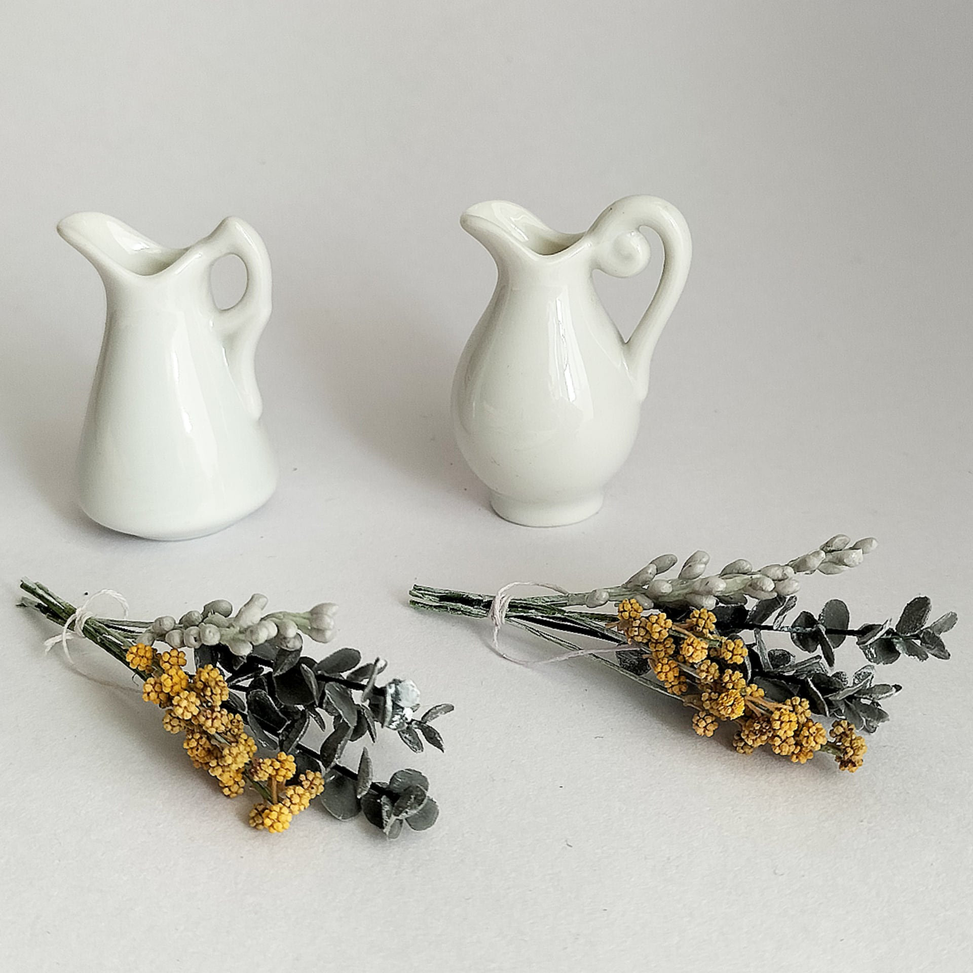 フォルムが可愛い 陶器製のピッチャー。 ナチュラルに束ねたドライリーフ。。 そっと 一緒に。 サイズは画像3枚目を参照ください。 ドライリーフは粘土製・一部ミモザはドライです。。