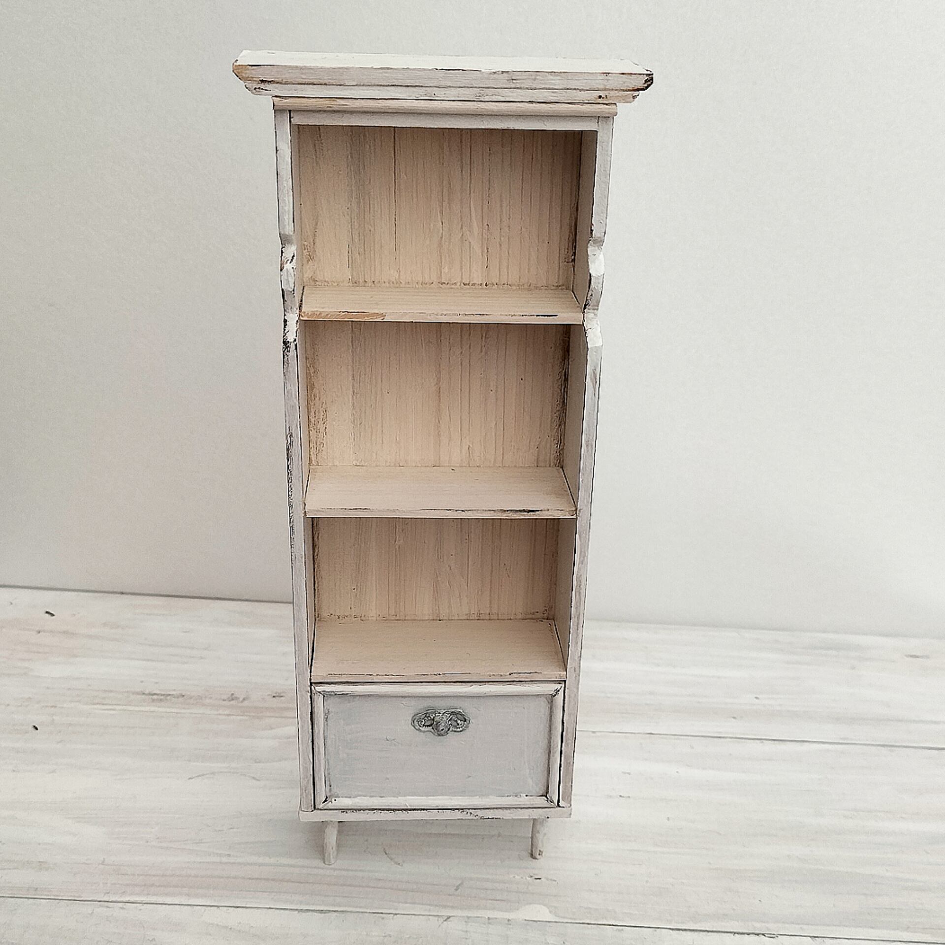 1/12サイズ レトロな雰囲気の背の高いシェルフ。 ドールハウスや お部屋のインテリアに。 側面ホワイト・背面はクリーム色を塗って、少し汚す加工をしております。 サイズは3・4枚目をご参照願います。 画像6枚目の小物は付きません。