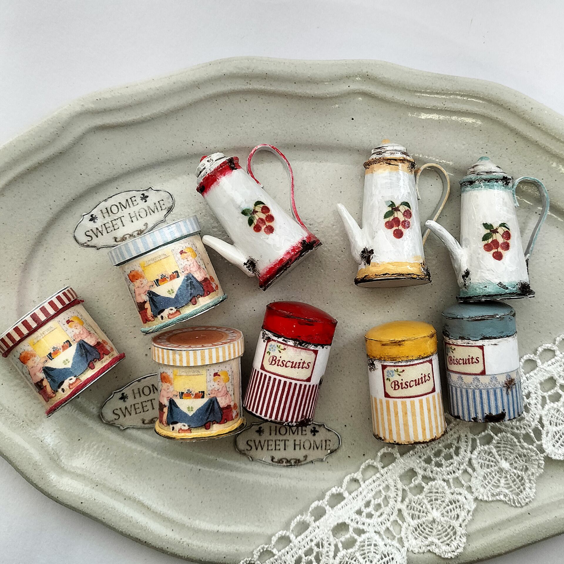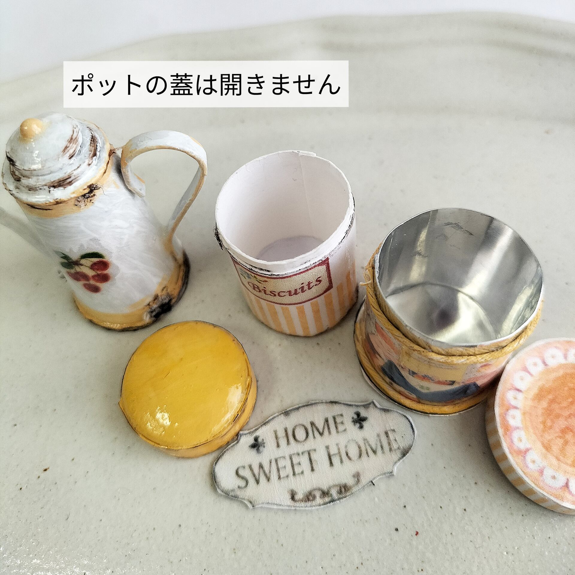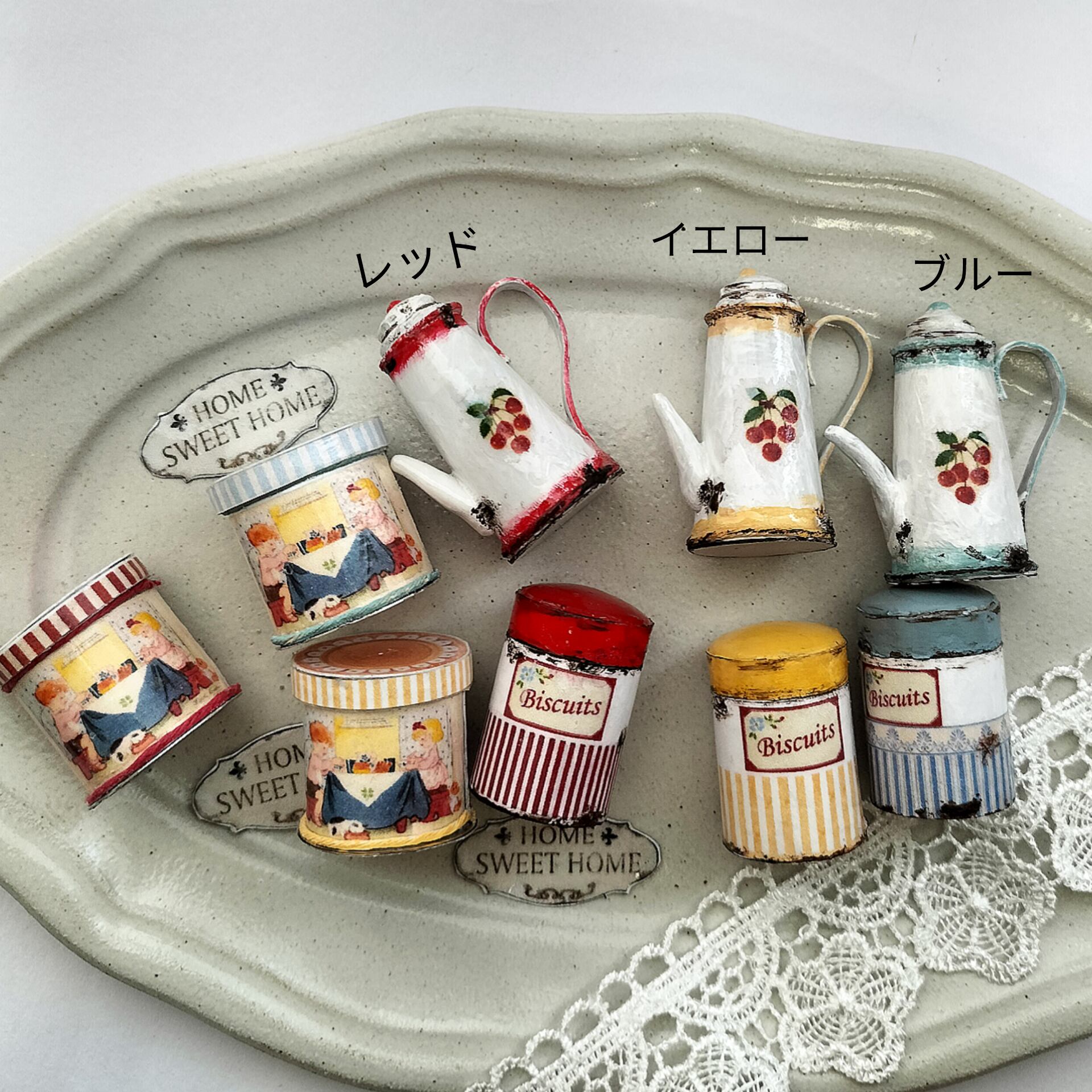 アンティーク風のチェリー柄ポットとキャニスターとかわいい柄の缶。。 ポットとキャニスターは紙製 キャニスターの蓋 一部プラスチック製 缶はアルミ製です セット内容(4店) ・チェリー柄のポット ・キャニスター ・缶 ・HOME SEWWT HOMEのプレート サイズは画像を参照ください。